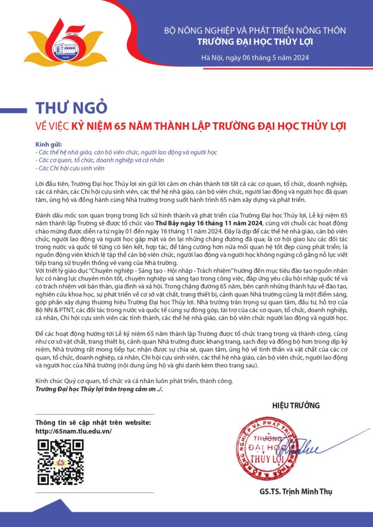 Thư ngỏ về việc kỷ niệm 65 năm thành lập Trường Đại học Thủy lợi