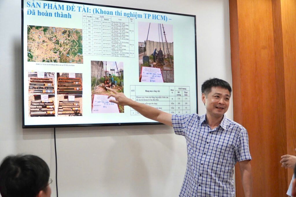 Tại buổi làm việc, PGS.TS Nguyễn Hữu Huế, Chủ nhiệm đề tài, đã trình bày báo cáo tổng hợp kết quả đạt được. Theo đó, nhóm nghiên cứu đã hoàn thành phần lớn kế hoạch khảo sát địa chất – đo đạc biến dạng nền đất và xây dựng cơ sở dữ liệu lún mặt đất tại khu vực TP. Hồ Chí Minh và một số đô thị trọng điểm vùng Đồng bằng sông Cửu Long.