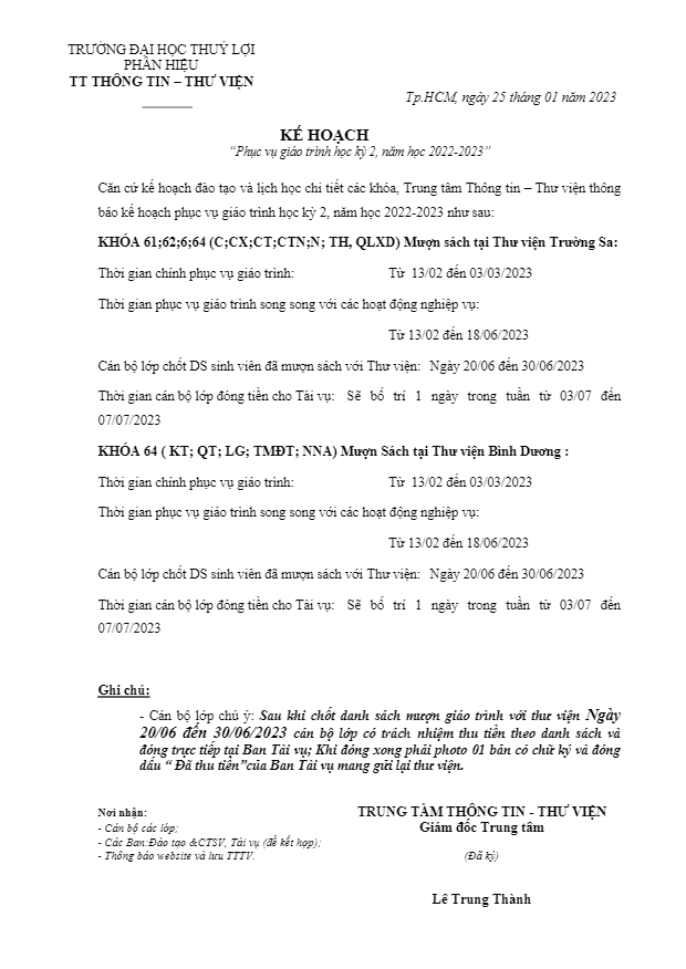 Kế hoạch phục vụ giáo trình HK2 2022-2023