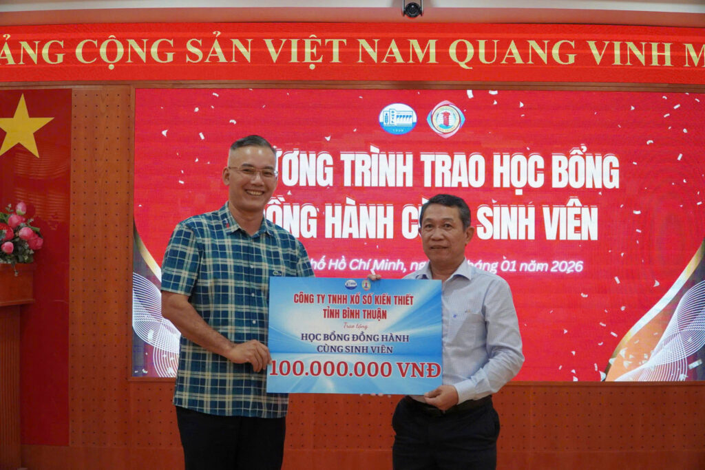 Vừa qua, ngày 17/01/2026, Phân hiệu Trường Đại học Thủy lợi đã long trọng tổ chức Chương trình Lễ trao học bổng “Đồng hành cùng sinh viên”, với sự đồng hành và tài trợ của Công ty Xổ số kiến thiết Bình Thuận. Chương trình mang ý nghĩa nhân văn sâu sắc, nhằm kịp thời hỗ trợ và động viên sinh viên có hoàn cảnh khó khăn, góp phần giúp các em ổn định cuộc sống, yên tâm học tập và rèn luyện.