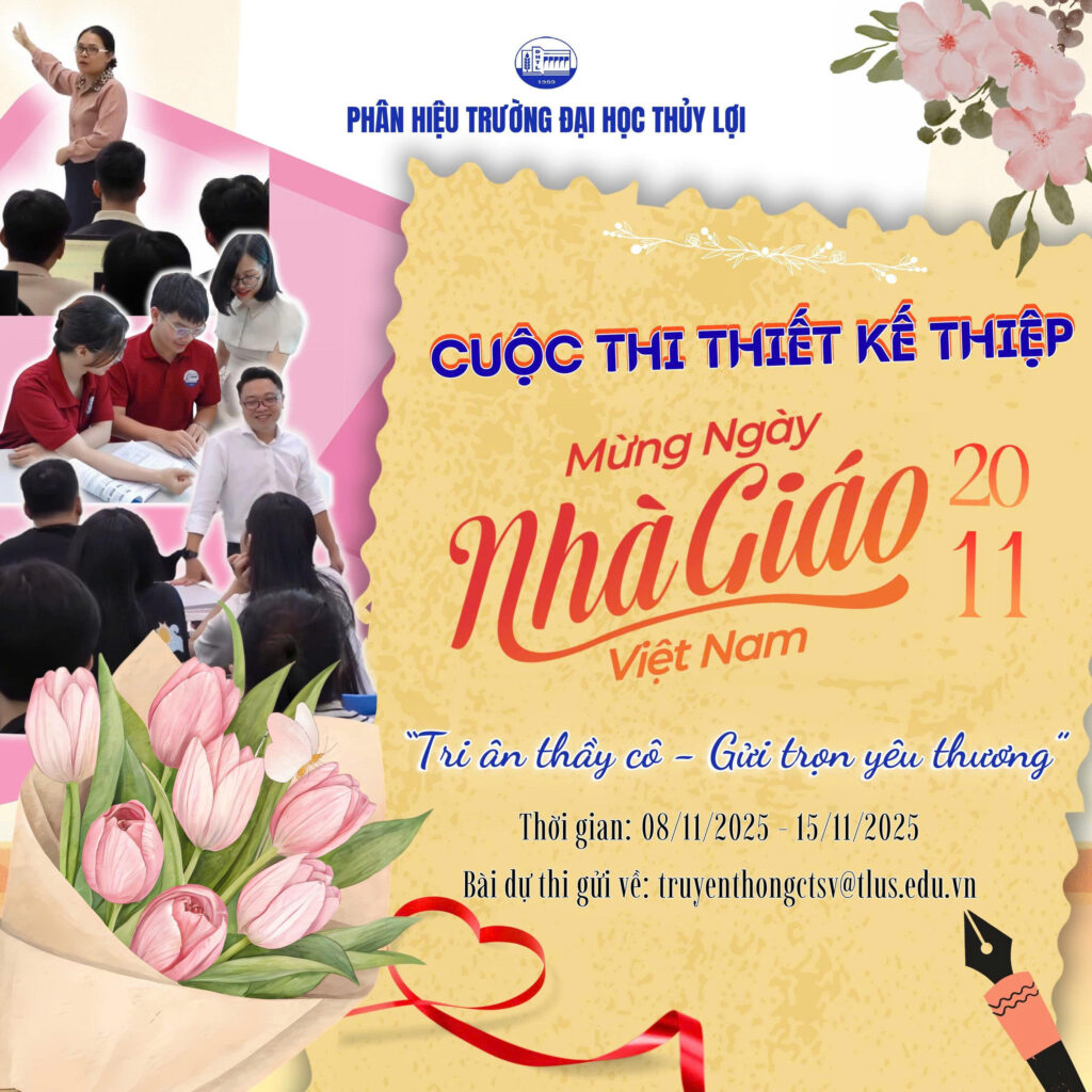 Nhằm chào mừng kỷ niệm Ngày Nhà giáo Việt Nam 20/11, tri ân công lao to lớn của đội ngũ giảng viên, cán bộ, viên chức đã và đang công tác tại Phân hiệu Trường Đại học Thủy lợi, Phòng Truyền thông và Công tác Sinh viên phát động Cuộc thi “Thiết kế thiệp chúc mừng Ngày Nhà giáo Việt Nam 20/11” với chủ đề “Tri ân thầy cô – Gửi trọn yêu thương”.