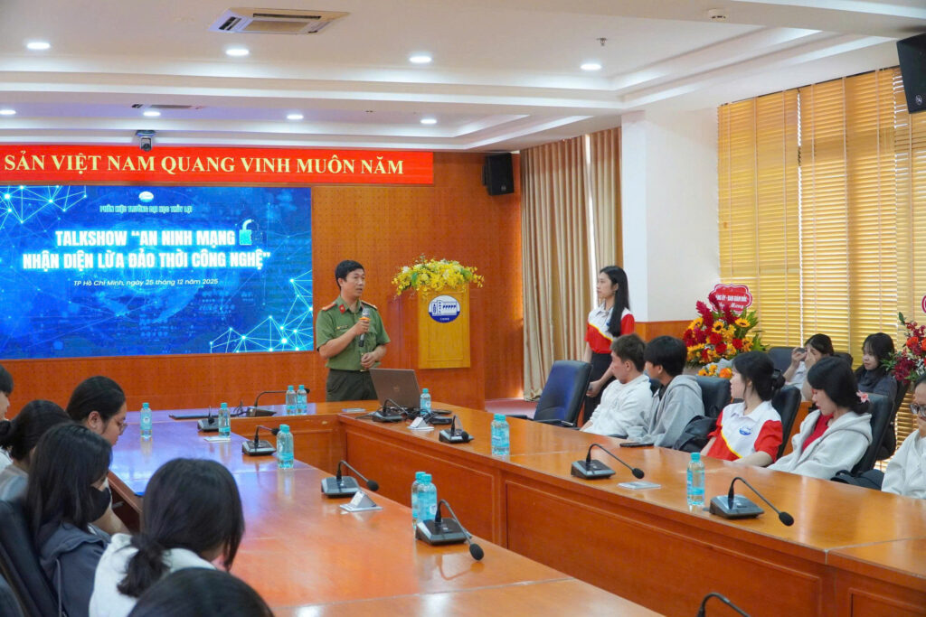 Sáng ngày 25/12/2025, tại Hội trường 202, Phân hiệu Trường Đại học Thủy lợi đã tổ chức talkshow “An ninh mạng – Nhận diện lừa đảo thời công nghệ” với sự tham gia đông đảo của sinh viên Phân hiệu với sự góp mặt của diễn giả Đồng chí Trung tá Nguyễn Huy Hoàng – Công an phường Thạnh Mỹ Tây.