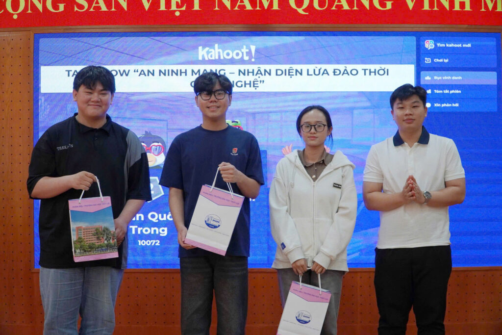 Bên cạnh phần chia sẻ kiến thức, chương trình còn tạo không khí sôi nổi thông qua hoạt động minigame tương tác, giúp sinh viên củng cố lại nội dung đã tiếp thu, rèn luyện khả năng xử lý tình huống và ghi nhớ kiến thức an ninh mạng một cách trực quan, sinh động. Những phần quà nhỏ từ Ban Tổ chức đã góp phần khích lệ tinh thần tham gia và tăng tính gắn kết cho chương trình.
