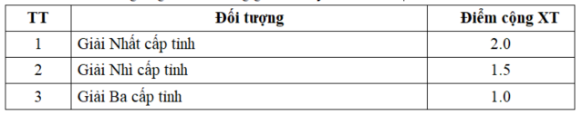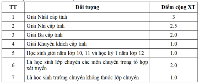 Thí sinh là học sinh đoạt giải học sinh giỏi cấp tỉnh, thành phố trực thuộc Trung ương các môn trong tổ hợp xét tuyển của ngành ĐKXT; học sinh các trường chuyên; học sinh giỏi năm lớp 10, lớp 11 và học kỳ 1 năm lớp 12 được cộng điểm vào điểm xét tuyển như sau: