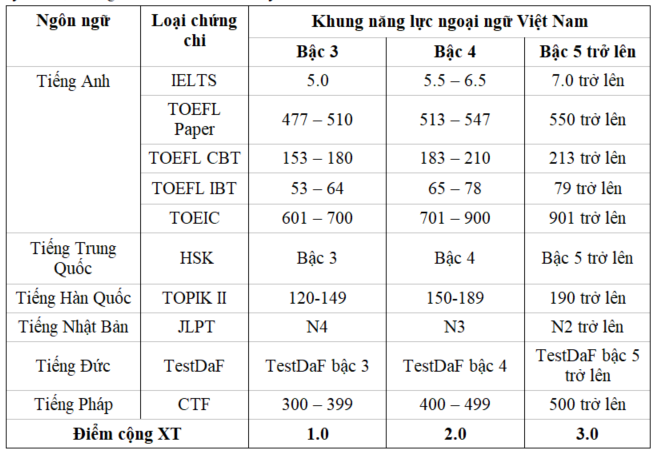 Thí sinh có chứng chỉ ngoại ngữ quốc tế còn thời hạn đến ngày xét tuyển được cộng điểm vào điểm xét tuyển như sau: