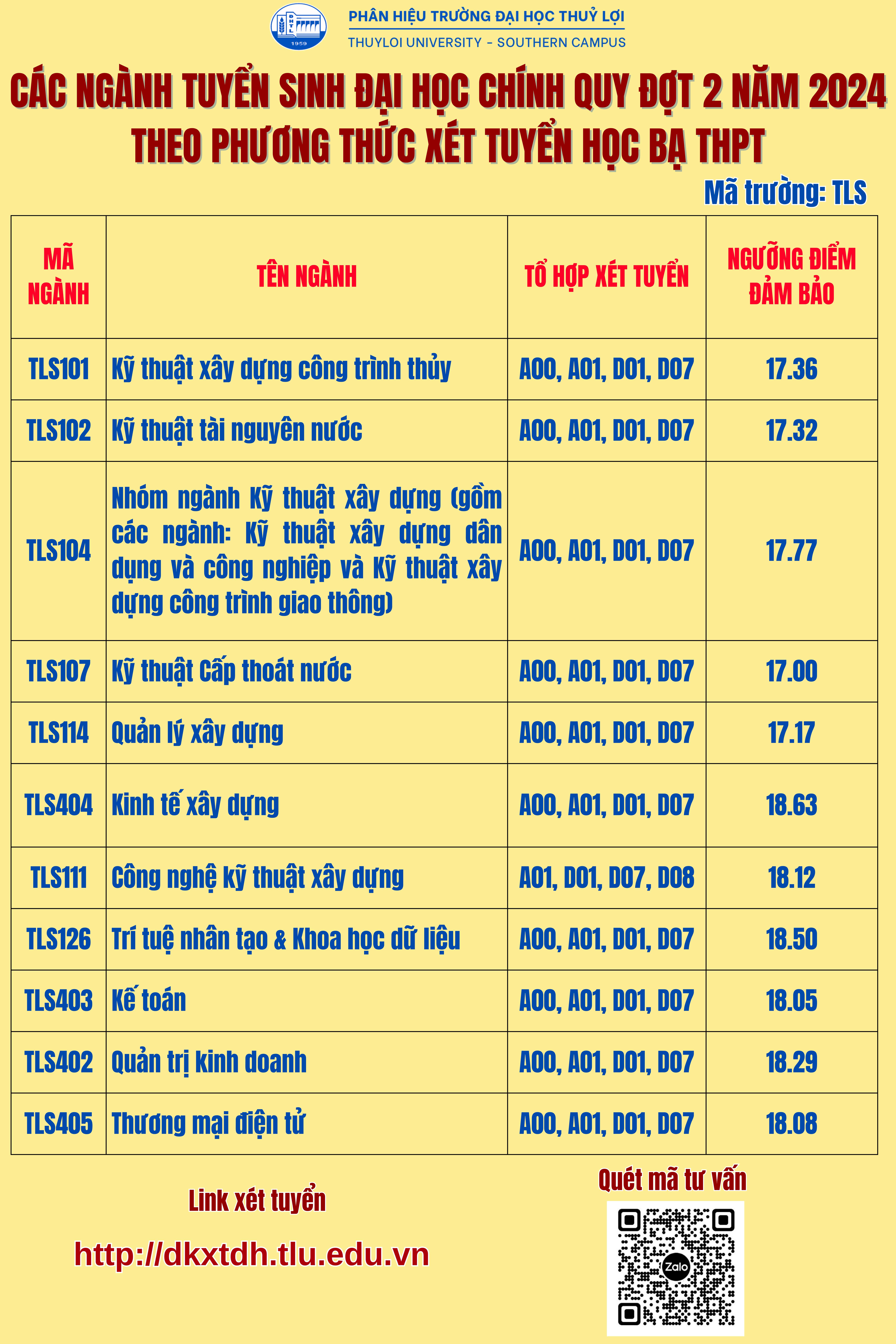 Phân hiệu trường Đại học Thủy lợi (Mã trường TLS), thông báo tuyển sinh trình độ đại học chính quy đợt 2 năm 2024 cho các ngành như sau: