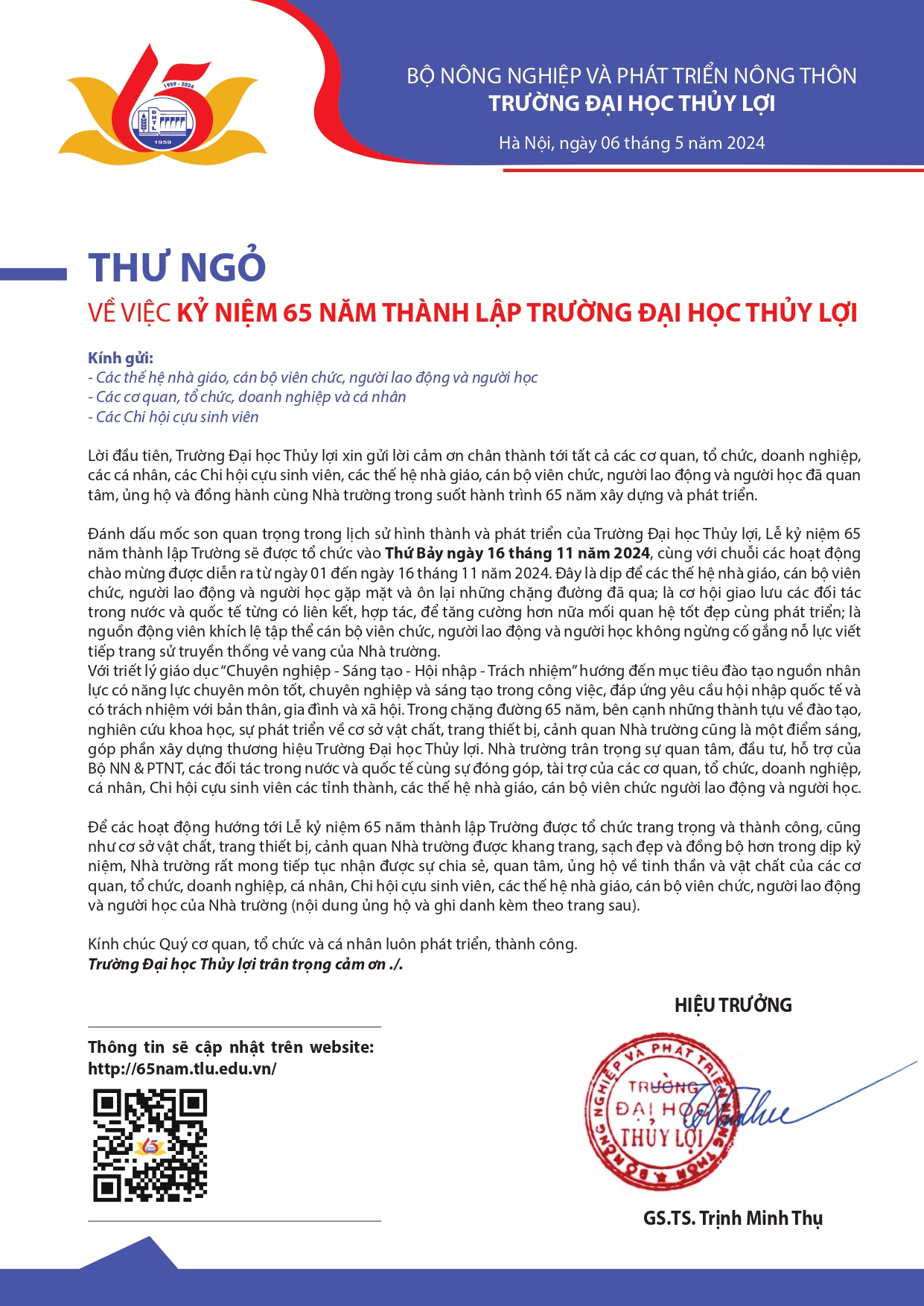 Lời đầu tiên, Trường Đại học Thủy lợi xin gửi lời cảm ơn chân thành tới tất cả các cơ quan, tổ chức, doanh nghiệp, các cá nhân, các Chi hội cựu sinh viên, các thế hệ nhà giáo, cán bộ viên chức, người lao động và người học đã quan tâm, ủng hộ và đồng hành cùng Nhà trường trong suốt hành trình 65 năm xây dựng và phát triển.